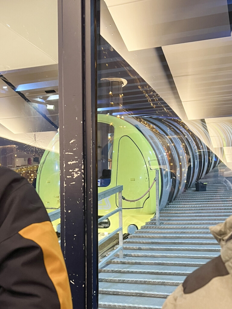 フニクレールは黄色い芋虫のような外観で、標高2100mから一気に3000mのところに上がり、長いコースを滑ることができます。