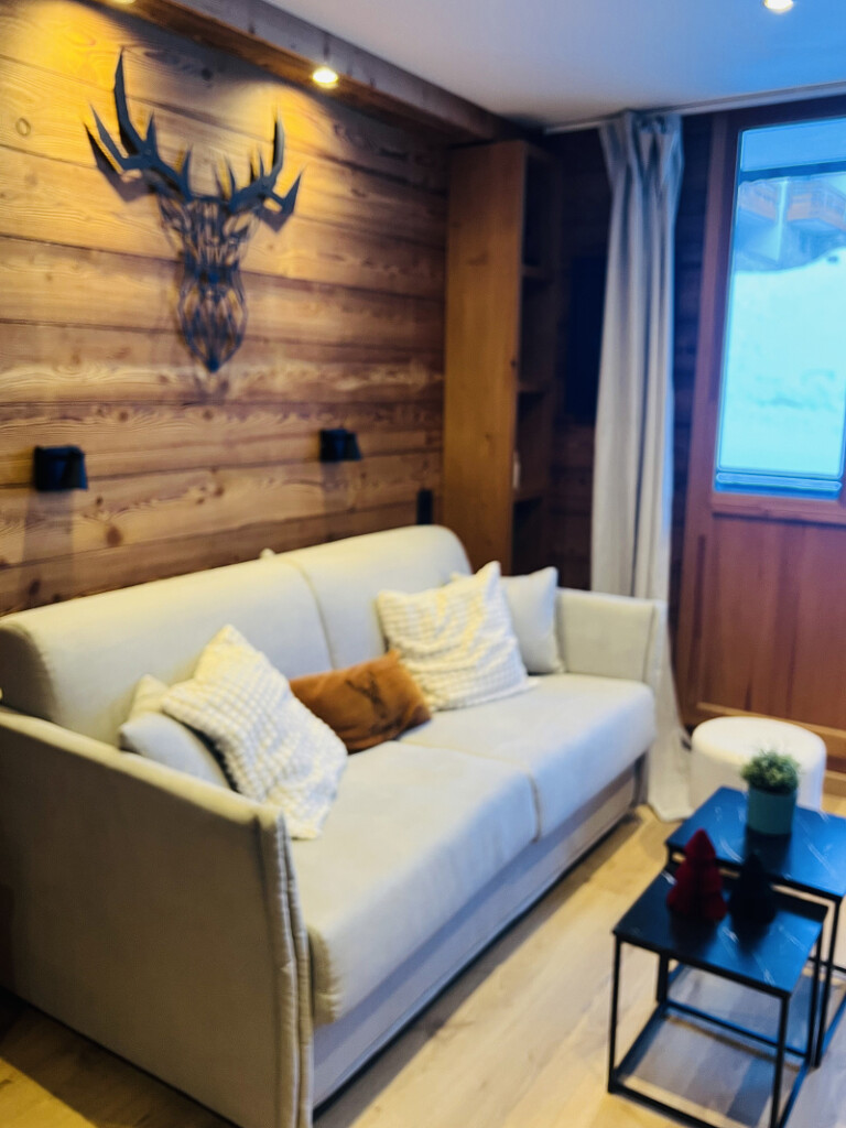 ウッディな室内に鹿のオブジェが素敵。このソファベッドを広げて寝ました。